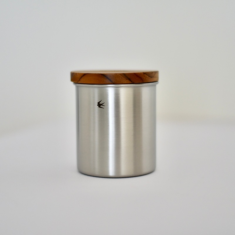 つや消しステンレスボディと、マットブラック塗装ボディの2種類。 チーク材の木蓋は樹脂パッキン仕様なので密封性があり、 風味が落ちやすいコーヒーや茶葉の保存にもピッタリです。